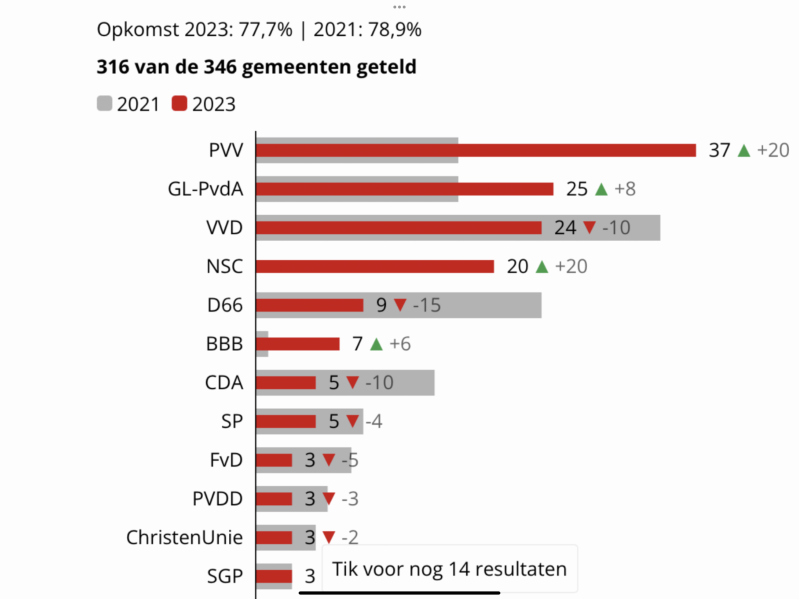 Maar de rechtse partijen in onze Kamer ontwikkelen een steeds sterkere afkeer jegens progressieve partijen en voelen zich blijkbaar wél comfortabel bij het rechts-populisme en schuiven inhoudelijk ook steeds verder die kant op. Van het politieke vedergewicht van der Plas was al bekend dat ze graag vriendjes met Geert wil zijn. BBB gedraagt zich al tijden als een loyaal PVV-filiaal. En dat de ratelende cliché-machine Yeşilgöz met haar niet meer te harden ingestudeerde praatjes steeds dichter tegen de PVV aankruipt, was tijdens haar niet te volgen verkiezingscampgne al zichtbaar. De partij dreigt PVV-light te worden en zij gaat via deze route op enig moment de VVD in chaos storten…markmywords. In een peiling van gisteren bleek dat haar party nu al was gezakt van de 24 zetels bij de verkiezingen naar 16 zetels nu. Terwijl de PVV gestegen was van 37 naar 43 zetels. Het zijn maar peilingen, maar toch niet iets om blij van te worden. En zo zal het blijven gaan: hoe dichter VVD tegen de PVV aanschurkt, hoe kleiner de partij wordt. Wanneer komt Klaas Dijkhof die partij redden?